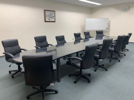 - 中央に大型テーブルがあり、それを囲むようにイスが配置されています。