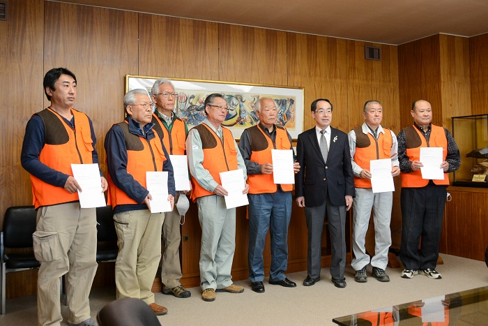 同日、各班の代表者7人が委嘱状を受け取り、鶴山博隊長は「猟友会が持っている知識や技能を発揮し、市民の協力を得ながら事故違反は起こさず、野生鳥獣の被害対策に寄与する」と決意を表明しました。