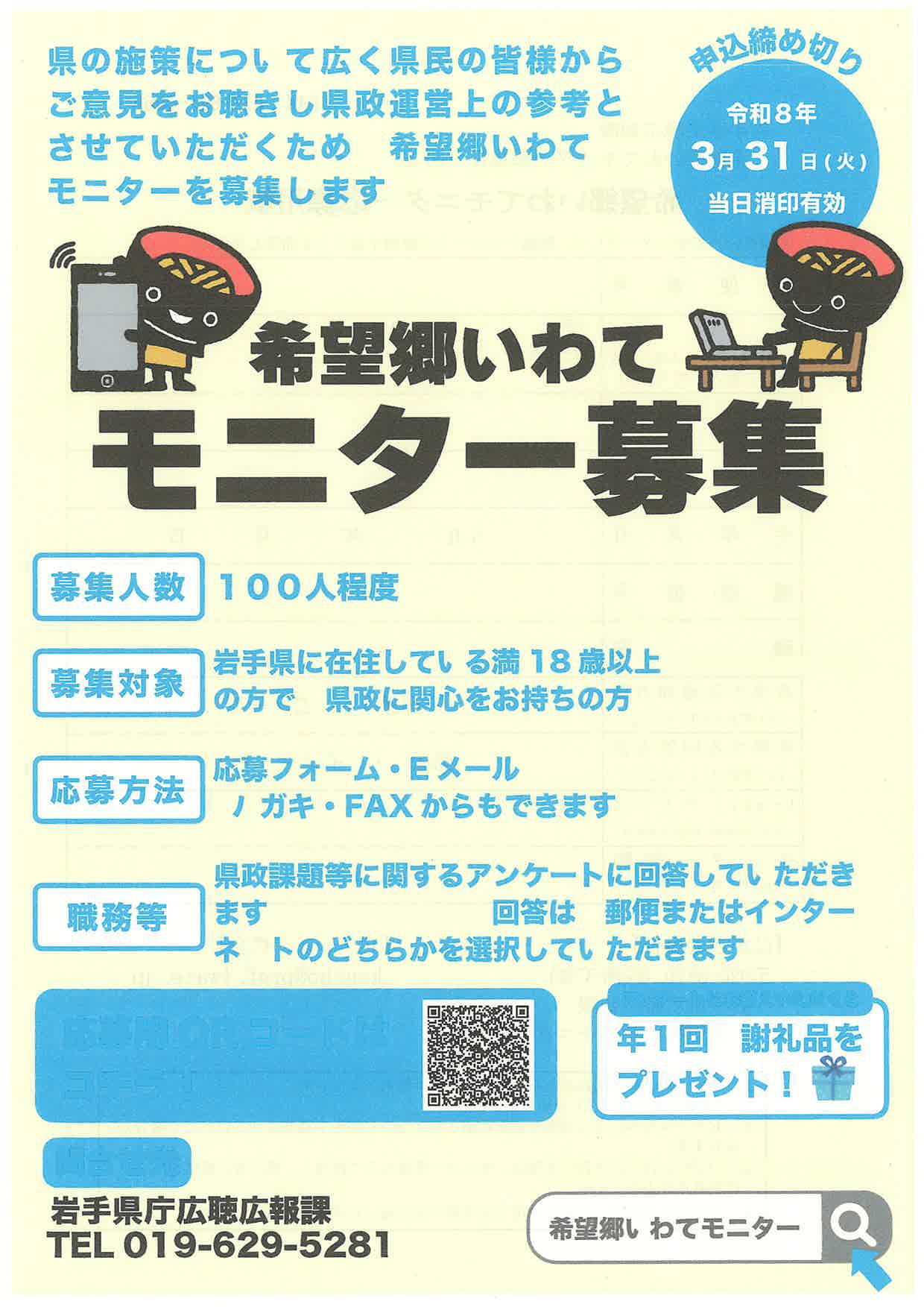 対象県内在住の18歳以上(公務員等除く) 任期令和8年6月1日~令和10年3月31日(2年間) 応募方法はがき、ファックス、Eメール、または、県ホームページの応募フォームから応募してください。 ▽はがき 〒020-8570(住所記載不要)県庁広聴広報課「希望郷いわてモニター」募集係 ▽ファックス 019-651-4865 ▽Eメール こちら ▽岩手県ホームページリンク先 岩手県 - 令和8~9年度希望郷いわてモニター募集 応募期限令和8年3月31日(火曜日)(注意)当日消印有効 選考結果令和8年5月下旬(予定)までに、応募いただいた方全員に通知します。 問い合わせ先県庁広聴広報課 019-629-5281 |