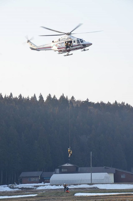訓練は事前に対処の流れを示さないブラインド型により実施。ドローンによる上空からの状況の監視や、防災ヘリコプターによる救助訓練、水利が近くにないことを想定した遠距離送水などが行われ、参加者らは真剣に取り組んでいました。