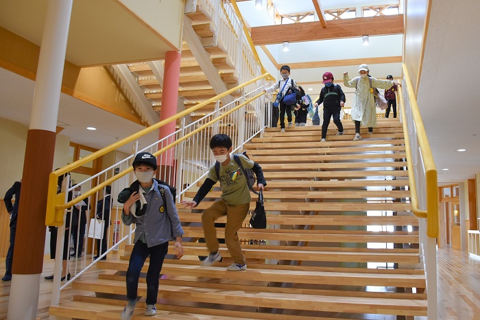 市立笠松小学校の落成式は4月23日、新校舎で行われ、児童や施工業者、学校関係者ら出席者約100人が完成を祝いました。式の中で同校の瀧野澤公美校長は「子どもたちは新しい校舎を見て歓声をあげた。充実した環境で活発に活動ができる。保護者や地域の皆さんと共に新しい歴史と伝統を作るべく努力したい」と、感謝と決意を述べました。